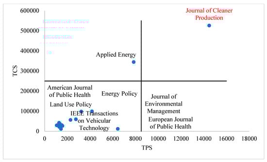Figure 10 shows that the Journal of Cleaner Production has the highest TPS and TCS values, indicating the highest research productivity and impact among the listed journals. Applied Energy has the second highest TPS and TCS values, followed by the European Journal of Public Health in third place but at a much lower TCS value. The remaining journals have progressively lower TPS and TCS values, with Marine Policy and Accident Analysis and Prevention having the lowest values.