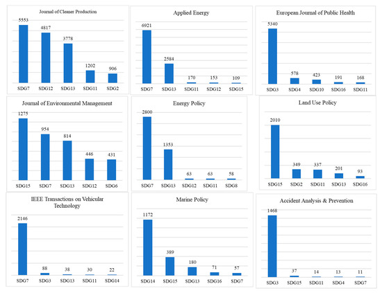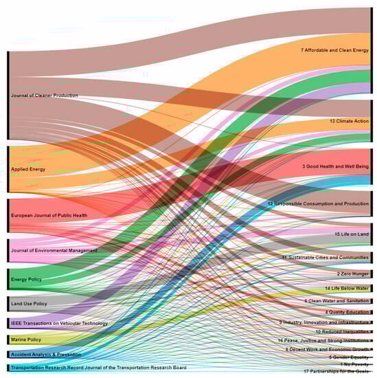 When it comes to the analysis of the SDG focus of journals, Figure 12 shows that the Journal of Cleaner Production (which published the highest number of publications and obtained the highest number of citations) is found to publish more works in SDG 7, followed by SDGs 12, 13, 11 and 2. The Journal of Applied Energy, which is highly cited but has not published many publications and can be expected to drift towards the quadrant of the Journal of Cleaner Production, also focused more on SDG 7, followed by SDGs 13, 11, 12, and 15. The rest of the journals are in the low number of publications–low citations category. While Energy Policy and IEEE Transactions on Vehicular Technology are found to focus more on SDG 7, the journals European Journal of Public Health and Accident Analysis and Prevention focus mostly on SDG 3. The journals Journal of Environmental Management and Land Use Policy are found to have SDG 15 as the prime focus. Marine Policy published more publications on SDG 14, followed by SDGs 15, 13, 16, and 7.