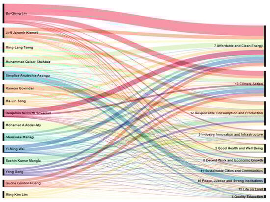 The Sankey diagram in Figure 11 shows that The Journal of Cleaner Production, Applied Energy, and the European Journal of Public Health are the top journals according to research productivity. These journals have the most publications mapped to multiple SDGs. The most commonly mapped SDGs for these top journals are SDG 7 (Affordable and Clean Energy), SDG 13 (Climate Action), and SDG 3 (Good Health and Well Being). On the other hand, the least commonly mapped SDGs for these journals are SDG 8 (Decent Work and Economic Growth), SDG 5 (Gender Equality), and SDG 1 (No Poverty). These patterns suggest that the top journals in the table tend to focus more on energy, climate, and health issues while publishing fewer publications on issues related to economic growth, gender equality, and poverty.