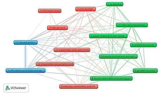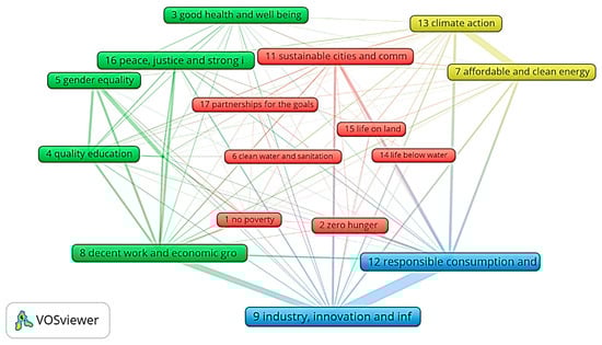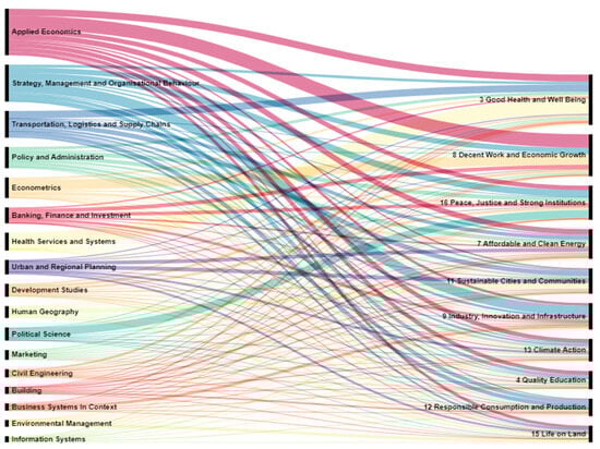 A Sankey diagram is a flow diagram commonly used to visualize the movement of resources within a system. The diagram’s arrows, or “flows”, represent the magnitude of the flow, while the rectangles, or “nodes”, represent the significance of the system’s elements. The width of the arrows is proportional to the flow’s relative magnitude, while the height of the rectangles reflects the relative importance of the elements within the system. Bibliometrics studies, such as those by [48,49,50], have used Sankey diagrams to visualize the intellectual structure of various aspects of research, including journals, authors, and countries. To design the Sankey diagram for mapping the top countries, top journals, top authors, and fields of research with SDG, “Rawgraphs” (Rawgraphs, n.d.) [51] has been used. Rawgraphs is an open-source data visualization framework built to simplify the visual representation of complex data for everyone [52]. Subsequently, “VOSviewer”, version 1.6.15, has been used for cluster analysis. VOSviewer is a software application for constructing and visualizing bibliometric networks [53]. For data filtering, sorting, listing, and graphs, “MS Excel” has also been used.