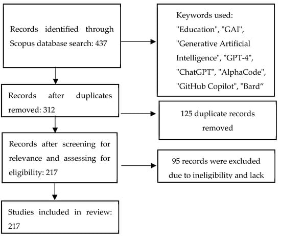 - Literature retrieval—This step entails selecting appropriate search terms and keywords to comprehensively capture pertinent publications related to the intended topic representing the initial and pivotal phase of the data collection process. We retrieved a compilation of pre-existing articles and publications in the domain of GAI in education from the Scopus database. By utilizing a combination of the following keywords, “Education”, “GAI”, “Generative Artificial Intelligence”, “GPT-4”, “ChatGPT”, “AlphaCode”, “GitHub Copilot”, and “Bard”, the authors conducted a targeted search across titles, abstracts, and keyword fields. This process resulted in the enlistment of a total of 437 papers, spanning the years 2018 to 2023.