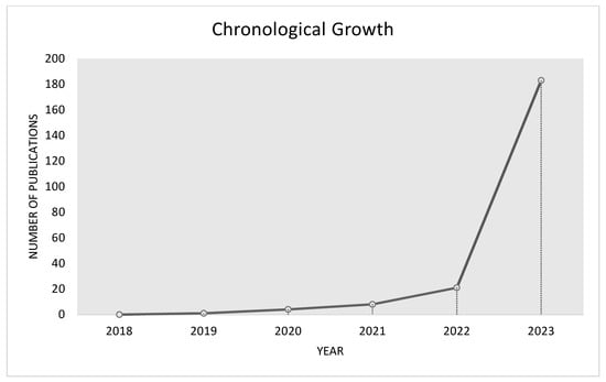 - Literature screening—The literature screening process for this study drew inspiration from the PRISMA statement, which is widely recognized as a rigorous and transparent approach for conducting systematic reviews and meta-analyses (Figure 1). PRISMA provides a structured framework to ensure the systematic identification, selection, and evaluation of the relevant literature, promoting the reliability and reproducibility of the review process [15]. Initially, a total of 437 papers were retrieved. Following the removal of duplicates, 312 papers remained. After observingly reviewing each publication, all articles that were deemed irrelevant to our research focus were discarded. We narrowed the list down to 217 reviews, papers, and publications that spanned from the years 2018 to 2023. The chronological growth of the papers (in the context of the topic) in the above-mentioned spanned years is depicted in Figure 2.