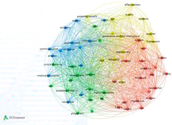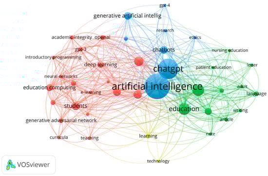 The relevant and frequently occurring terms were identified by analyzing the text data of the 217 selected publications. The analysis of text data looks to extract relevant terms from the titles and abstracts of the selected articles and constructs a network of co-occurrence links between them [151]. This analysis enables us to detect any emerging developments and identify impactful terms within the field of GAI in education. A total of 4408 terms were generated, out of which 102 terms meet the minimum threshold of 10 occurrences. To further narrow down the selection of terms, VOSviewer calculated a relevance score for each term, and the top 60% most relevant terms were selected, resulting in the 61 terms that were displayed in the network seen in Figure 4. Terms with a high relevance score represent more specific topics covered by the text data, while terms with a low relevance score tend to be of a general nature [151]. A thesaurus was created and uploaded to VOSviewer for the standardization of keywords and the elimination of duplicate terms [152].