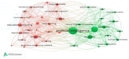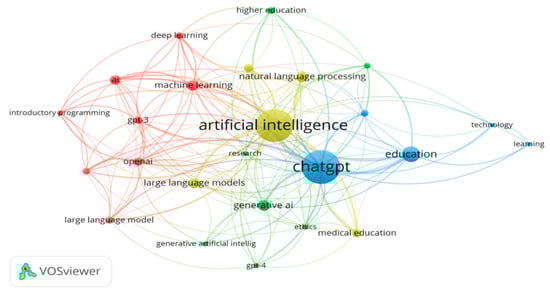 To provide an in-depth analysis of the current state of GAI in education, we utilized VOSviewer to generate five types of visualization maps. These maps are designed to provide a comprehensive analysis of the topic. Each map consists of circles that represent different items such as publications, researchers, or terms. The size of the circle and the font within it indicate the level of activity associated with that item. A larger circle and a bigger font size indicate a higher level of activity, whereas a smaller circle and a smaller font size suggest less activity. The distance between any two terms in the diagram reflects the degree of association between them. A shorter distance signifies a stronger correlation, whereas a longer distance indicates a weaker correlation [151].