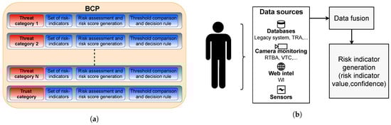 (a) Each border control point (BCP) considers several threat categories corresponding to identified threats and a trusted category that are composed of a set of risk indicators. These indicators are used to generate a risk score which is compared with a threshold by a decision rule; (b) Each risk indicator is determined from heterogeneous data sources (e.g., databases, cameras, the world wide web, sensors, etc.) along with a confidence value using data fusion.