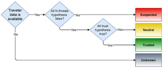 - Stage 1: This stage represents the pre-travel or the planning phase when the journey has not yet started. Associated components 1 and 2 do not require the physical presence of travelers and have zero service time, thereby not introducing any queues into the system. After Stage 1, the risk of all travelers is evaluated and corresponding risk groups, as shown in Figure 2, are determined. Travelers who are classified as Unknown (represented by black arrow), which also includes travelers not providing any personal information voluntarily, and Suspected (represented by red arrow) are navigated to Stage 3, while, on the other hand, travelers classified as Trusted (represented by green arrow) and Neutral (represented by yellow arrow) are navigated to Stage 2;