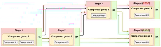 A simple BCP with five travel stages and component groups, with six different types of components The color scheme of the arrows is the same as the color scheme of the risk groups shown in Figure 2.