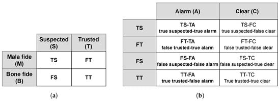 Modeling of the border guard: (a) The confusion matrix represents the classification of travelers as suspected and trusted by the risk-assessment method. The possible classifications are True suspected (TS), False trusted (FT), False suspected (FS), and True trusted (TT). These classes act as the a priori for the border guard evaluation; (b) Border guards are considered as binary components, with the output class either to be “Alarm (A)” or “Clear (C)”; based on the a priori and the output class, there are eight possibilities, as shown in the figure.