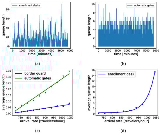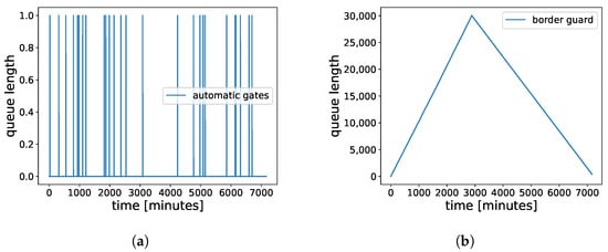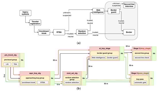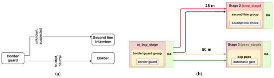 In the risk-based configuration shown in Figure 7, there are three travel stages, appr_bcp_stg, at_bcp_stg, and pass_stg, with “enrollment kiosk”, “border guard”, and “automatic gate” components having non-zero service time. All the service time values are listed in Table 3. In terms of the spatial geometry of the BCP, both border guard and automatic gate are placed at a distance of 50 m from the enrollment kiosk. Furthermore, the distance between the border guard and the automatic gate is also 50 m. The distances determine the time required to walk between stages. The interaction times at stages are determined by their components.