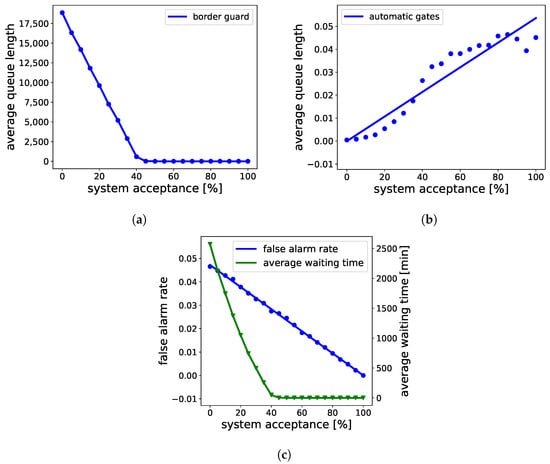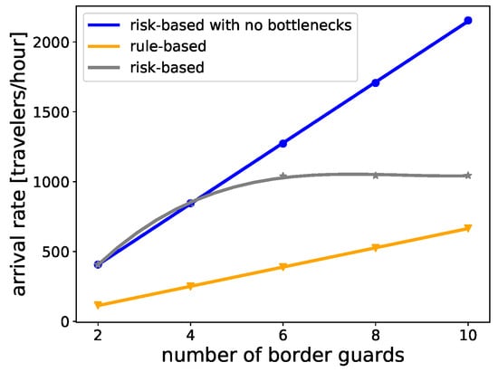 At border control, border guards are the most critical and expensive resource, in particular after the COVID-19 pandemic [68]. In order to estimate the flow performance, Figure 8 compares the maximum arrival rate of travelers that a configuration can handle while keeping the average waiting time of travelers under one minute. Three different types of configurations are compared: rule-based, risk-based, and risk-based with no other bottlenecks, i.e., zero service time for enrollment kiosks.