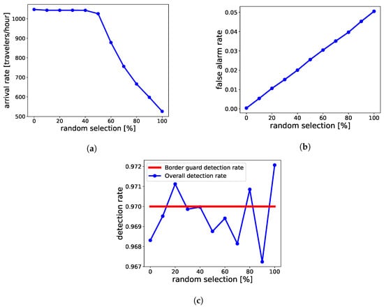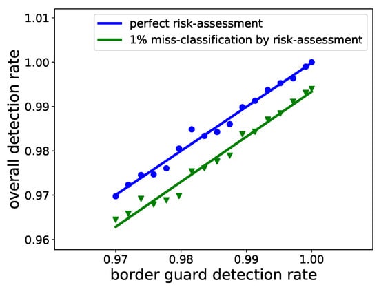 In a risk-based configuration, the border guard has a priori information based on the classification of risk-based evaluations, as shown in Figure 2. Based on this a priori information and their experience, they make their decision. To model the border guard, this a priori information is also considered, as shown in Figure 5. Using this methodology a border guard’s performance can be quantified by four values highlighted in Figure 5b. These values are renamed as per the ontology used by the border control operators and are shown in Table 1. In the current article, due to the lack of publicly available data, is the same as , and as .