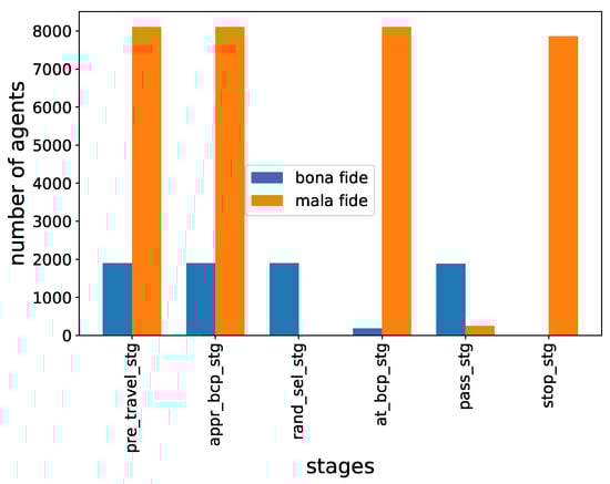 All the simulations were performed on a standard computer without using multithreading and distributive computing. The complexity of the simulation increases with the number of interaction points (stages) or the number of agents. There are other parameters like the number of risk indicators used for traveler profiling that also increase the complexity of the simulation, but these parameters were kept constant for all the simulations. Each simulation took between 2 and 5 min to complete.