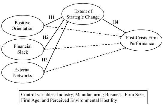 Our study looks at the 2008 global financial crisis, which took place between mid-2007 and early 2009. The research period is 2010–2012. For this study, we propose a model of strategic change based on the environment–strategy–performance paradigm [17,18]. In essence, the model theorizes that post-crisis firm performance is related to what kind of changes the firm makes to the business and the extent to which it changes [19]. We begin by investigating the kind of strategic change commonly undertaken by industrial firms facing an economic downturn or recession. We then investigate the factors that may influence the firm’s extent of strategic change. We conduct a thorough review of the literature on how firms successfully recover from sudden environmental jolts (e.g., industrial actions, regulatory changes, terrorist attacks, extreme weather events, and economic crises) and propose that strategic change is affected by three distinct factors: an organization’s orientation towards adversity, financial slack, and external networks. We then examine the simultaneous effects of these factors on the extent of strategic change. Finally, we test the relationship between the extent of strategic change and post-crisis firm performance while controlling for owner-managers’ perception of environmental hostility, firm age, firm size, and possible industry effects.