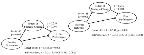 The positive and significant coefficients of positive orientation, external networks, and the extent of strategic change suggest that positive orientation and external networks have positive significant effects on firm performance through strategic change. To examine the significance of these indirect effects, we conducted a post-hoc analysis using the PROCESS tool [92]. PROCESS is regression-based and uses a bootstrapping method for analysis. Figure 2 presents a graphic summary of the PROCESS results. The indirect effects of positive orientation are significantly greater than zero at a 95% confidence interval [0.013, 0.092]. Similarly, the indirect effects of external networks are significantly greater than zero at a 95% confidence interval [0.013, 0.088]. The results thus show that positive orientation and external networks positively and significantly affect firm performance in both a direct and indirect way, while financial slack only has a significant direct effect on firm performance.