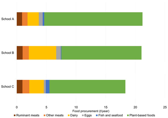 Baseline food procurement (t year−1) and related emissions (t CO2e) were calculated using the UCPH, CFP, and DSK databases for all three schools (Table 5). Schools A and B purchased almost the same amount of food per year (21.2 and 21.1 t year−1). It is notable that even though Schools A and B were 6–7 times larger in terms of pupil numbers than School C, the total procurement of food in School C was only 13–14% lower than that of the other schools.