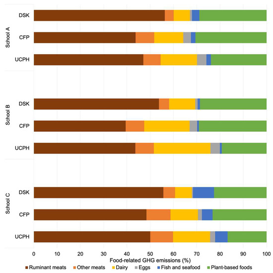 Table 5 shows the differences between the databases and between the baseline emissions per unit of food that the schools procure. Emissions from the CFP database were 40–45% higher than those found when using the UCPH database, and results from the DSK database fell in between those, generally with results closer to the UCPH database. Differences between baseline emissions per unit of food calculated by the databases were statistically significant in an ANOVA test of variance (p-value 0.005), while the differences between the schools’ individual baseline emissions per unit of food were not (p-value 0.7). Thus, the differences in the methodology used for calculation of the database emission factors were large enough to be statistically significant when applied to the three case schools, which have different procurement practices. The differences between the schools regarding the food they bought (Figure 1) were not large enough to obscure the effects of the database methodology on the calculated GHG emissions. Additionally, the choice of database led to markedly different GHG emission profiles of the procured food (Figure 2).