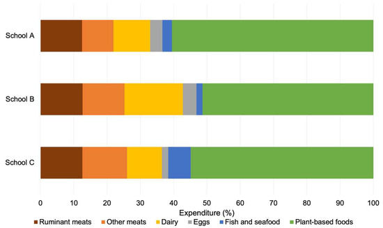 The baseline food expenditure divided between the main food groups was assessed for the three schools, and in general, their spending patterns were similar (Figure 3). The schools spent 39–49% of their food budget on animal products, which accounted for 22–36% of their total procurement by weight (Figure 1). Ruminant meat was the most expensive food item purchased by the schools, with 12–13% of the food budget going to beef and mutton, though these items only accounted for 4–5% of the schools’ procurement by weight. Relative to the amount (kg year−1) of food purchased, School A had the highest expenditure, with spending per purchased kg being 14 and 20% higher than Schools C and B, respectively. This was the case even though School A had the lowest relative procurement of animal products compared to the other two schools. The reason for this can be found in the differences between the types of products within each category the schools purchased. School A purchased animal products that were on average 45 and 53% more expensive per kg than those purchased by Schools C and B, respectively, and plant-based foods that were slightly more expensive per kg than those purchased by the other two schools. Thus, even though the schools all used the same supplier and were all subject to the same municipal regulations, there was still room for maneuvering within the budget according to conditions on the individual school with regard to choosing cheaper or more expensive options within each food category from the supplier. For School A, the main driver behind choosing more expensive animal products was most likely a preference for halal slaughtered meat.