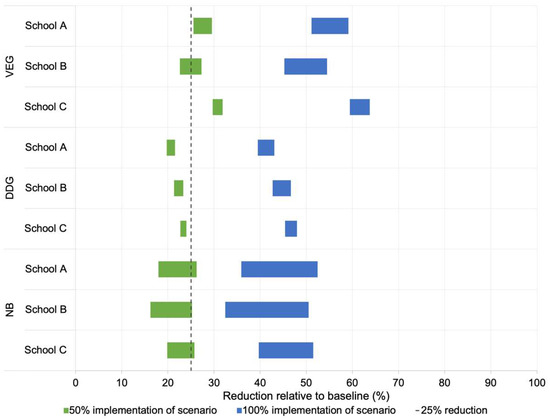 All three scenarios for all schools did lead to larger reductions than the municipality’s current target of 25% at higher implementation levels (Figure 4). Full implementation of the VEG scenario led to reductions of 45–64%, while the DDG scenario led to reductions of 39–48% and the NB scenario to reductions of 32–52%. Thus, by simply adhering to the national dietary guidelines, emissions from school food can be reduced by approximately 40%. When comparing the effect of the scenarios, it is important to be aware that the DDG scenario is deceptively ambitious with regard to meat consumption as the current dietary guidelines include much less meat than current diets. Full implementation of the DDG scenario would, in fact, lead to reductions in meat consumption of 60–71% relative to baseline levels.