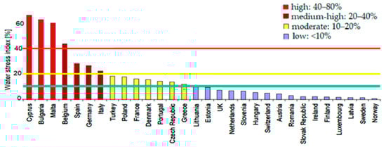 The four categories of European countries are marked by green, yellow, and red horizontal lines according to their water stress index (adapted from [5]).