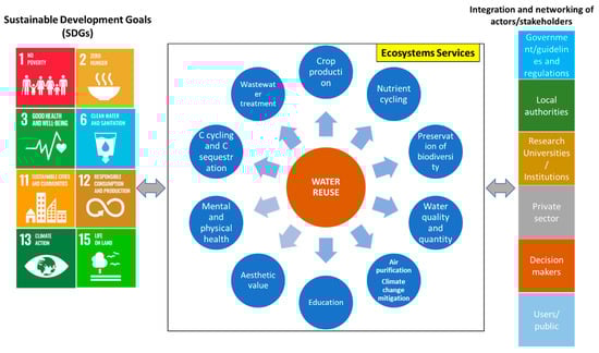 The management of water reuse schemes is still a great challenge, arising mainly from certain deficiencies in different domains of governance and the involvement of numerous actors/stakeholders [53]. This review highlights the application of a holistic approach in the management of water reuse schemes, based on an integrated and flexible management framework, covering local and national social-economic, political, environmental, and climate specialties and involving important actors/stakeholders (e.g., authorities, decision makers, the private sector, and end-product consumers) [6,23,54,55]; Recent work has discussed the integrated water management model and the most important elements that should be included in it [6]. The main goal of this is to build a supportive framework of actions that will help in considering, identifying, and prioritizing the issues, challenges, and opportunities in the domain of water reuse and in achieving specific objectives, such as the establishment and application of quality criteria for the different reuse types either for effluent or receptors, ensuring the effective involvement and collaboration of all actors/stakeholders by applying an efficient control and monitoring program, based on the evaluation of the potential impacts and protection of the environment, natural resources, and humans’ health and prosperity. From this point of view, the consideration and assessment of the potential impacts on ecosystem services (ESs) [56,57,58] and the consequences of achieving the established Sustainable Development Goals (SDGs) [59,60] are also necessary; however, little work has been done so far in the domain of water reuse.