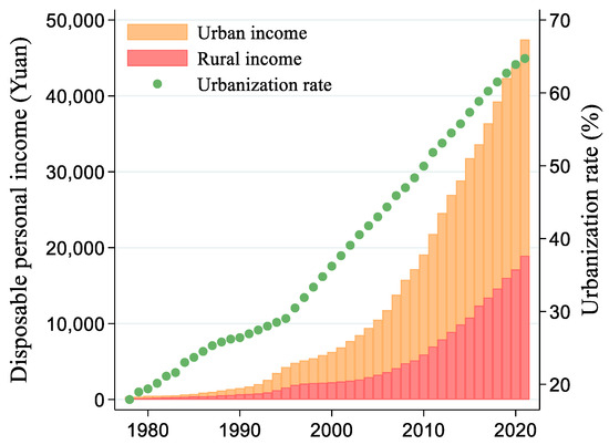 Figure 1. China’s urbanization rate and disposable income from 1978 to 2020.