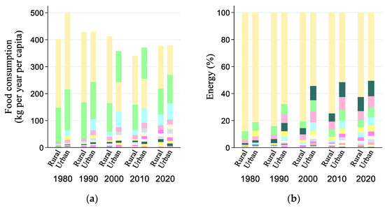 Diet is commonly mentioned as a major driving force for GHG (greenhouse gas) emissions, water footprint, and arable land footprint, which is expected to continue [2]. Most previous studies mainly examined single environmental demand, such as carbon emissions, water resources, and arable land, under different dietary patterns [3,4,5,6,7,8,9]. Meanwhile, China is a typical dualistic society with large differences between urban and rural areas and certain differences in per capita income and food intake among urban and rural residents. With the advancement of urbanization, the trend of food intake of urban and rural residents and its impact on the environment is a scientific issue worth exploring. Against the backdrop of reshaping urban–rural relations in China, there are few discussions on the environmental impacts caused by the dietary needs of urban and rural residents. Combining the inevitable trends of population growth, urbanization, and per capita income, we have separately explored the environmental impact of future dietary choices for urban and rural areas. This paper fills these knowledge gaps by addressing the following: (1) identify the current differences in the environmental burden of food consumption between urban and rural areas in China; (2) estimate the trend of future changes in the environmental burden of food consumption in urban and rural areas; and (3) explore the gap in environmental burden between the current diet and alternative healthy dietary scenarios. Although this is a case study, which is based on China’s national situation to explore the direction of sustainable food system transformation and the path to achieve it, it is hoped that the results of the study will provide Chinese wisdom and Chinese solutions for global food system research and theoretical exploration and can facilitate discussion and inform policy-making in other developing countries.