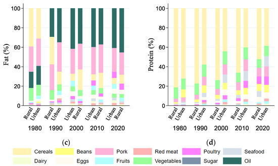 Figure 2. Composition of per capita food consumption and its contribution to macronutrients in China from 1980 to 2020. (ad) represent food composition, energy (%), fat (%), and protein (%), respectively.