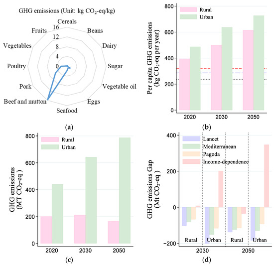 Figure 3. GHG emissions from China’s food consumption. (a) Carbon emissions per unit of food, (b) Carbon emissions from per capita food consumption, (c) Total carbon emissions from annual food consumption, (d) the total GHG gap of food consumption in different scenarios based on the current situation. Note that the red dashed line, the blue long-dashed line, the grey short-dashed line in the subfigure (b) represent the per capita GHG of food consumption in the China Pagoda scenario, EAT Lancet scenario, and Mediterranean scenario, respectively. The black short-dashed line in the subfigure (d) represents the urban-rural separation.