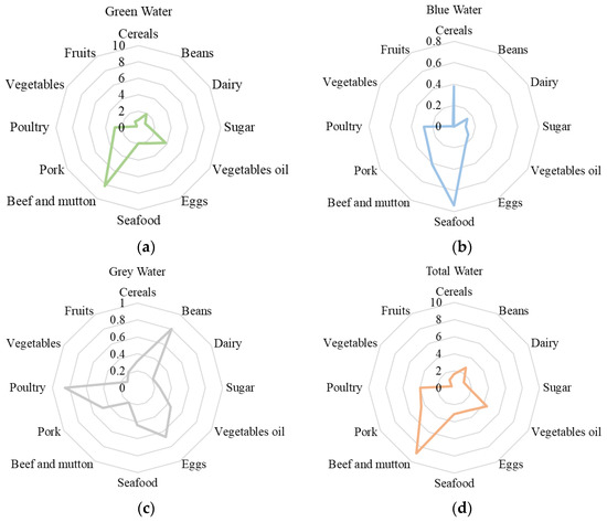 Figure 4. Water footprint of different types of food (Unit: m3/kg). (a) Green water footprint per unit of food, (b) Blue water footprint per unit of food, (c) Grey water footprint per unit of food, (d) Total water footprint per unit of food.