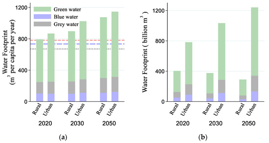Figure 5 displays the findings of calculations of the water footprint (WF) (green, blue, and gray water) resulting from food consumption by urban and rural populations in China in 2020 (2030, 2050). There are significant differences within each WF intensity of the present diet, as predicted. While the blue and gray WFs caused by per capita food consumption are essentially equal between urban and rural areas in 2020, the green WF caused by per capita food consumption of urban residents is slightly higher than that of rural residents. From the perspective of the WF of consumption food categories, the WF of per capita consumption of plant food is significantly higher than that of animal food (except for green WF in urban areas). This is determined by the percentage of plant-based foods in the current diet.
