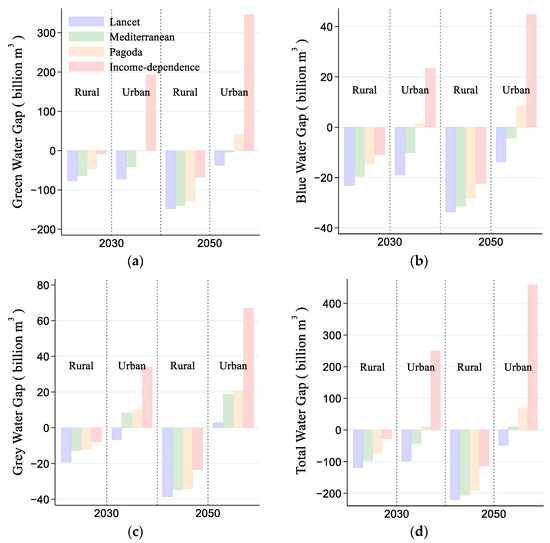 Figure 6. Water footprint gap from China’s food consumption in 2030 (2050). (a) Green water footprint gap, (b) Blue water footprint gap, (c) Grey water footprint gap, (d) Total water footprint gap. Note that the black short-dashed line in the subfigure (ad) represents the urban-rural separation.
