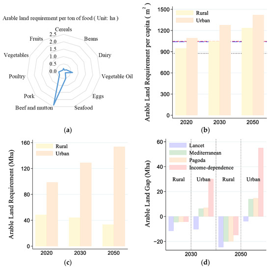 Figure 7. Arable land requirement of food consumption in China. (a) Arable land requirement per unit of food, (b) Arable land requirement per capita, (c) Total arable land requirement, (d) Arable land gap. Note that the red dashed line, the blue long-dashed line, the grey short-dashed line in the subfigure (b) represent the arable land requirement per capita in the China Pagoda scenario, EAT Lancet scenario, and Mediterranean scenario, respectively. The black short-dashed line in the subfigure (d) represents the urban-rural separation.