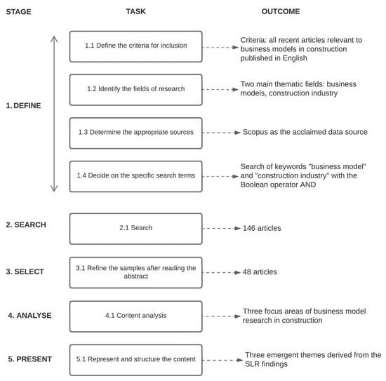 In this section, the systematic research method adopted in the paper will be described in three parts: (1) the rationale for using a systematic literature review (SLR), (2) the search strategy for shortlisting papers and (3) the coding constructs of the content analysis to identify emergent themes from the short-listed papers. SLRs can enhance integrative reviews in management research by applying transparent and replicable protocols [57], thereby synthesising previously published work while maintaining transparency and reducing bias using the established principles of PRISMA [58]. This paper aims to integrate research related to the study of business models in construction to elucidate the terminology, evaluate its application in the construction industry to date, and determine its future utility in facilitating strategic transformation. A significant aspect of achieving this aim is synthesising different theoretical viewpoints on business models, which can be accomplished through SLRs [59,60].