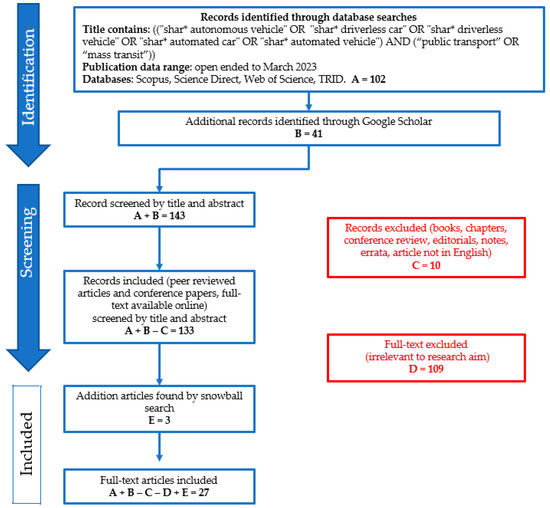 The literature selection procedure is shown in Figure 1 and inspired by Golbabaei et al. (2020) [14]. The keyword combination used in the search strategy was (“shar* autonomous vehicle” OR “shar* driverless car” OR “shar* driverless vehicle” OR “shar* automated car” OR “shar* automated vehicle” OR “shar* autonomous taxi”) AND (“public transport” OR “mass transit”) within the article title, abstract or keywords. The asterisk (*) enables to include different forms of the same word: shared or sharing. Books, editorials, notes, errata, articles not in English and conference reviews were not included. Book chapters were excluded because they had been published in journals or were reprints of published papers. In addition, reviews were not included since they represent a synthesis of already published articles. A large amount of articles (109) were excluded as not relevant for the scope of this study. In most of those cases, SAVs are intended as potential substitutes or competitors of PT systems, instead of being seen as an integrative service.