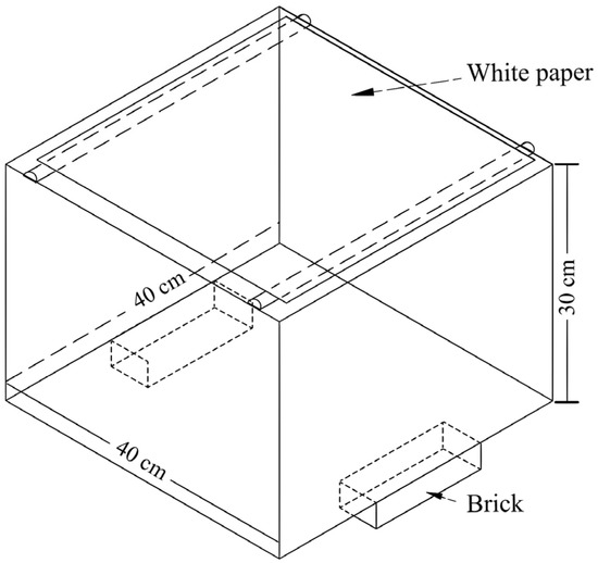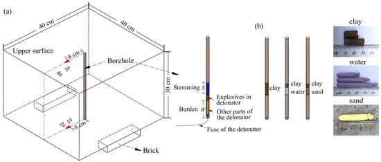The explosion experiments were conducted in the Fankou Lead–Zinc Mine blasting laboratory. During the blasting process, the test specimens were placed on a steel plate, and two square bricks were used to support the specimen, ensuring that the bottom surface of the specimen was free. As shown in Figure 1a, a 300 mm long, 8 mm diameter borehole was centrally positioned in the specimen, penetrating through the upper and lower surfaces of the test block.