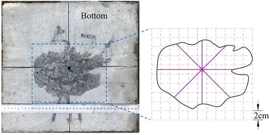 The blasting crater’s mean radius and area were measured using the method illustrated in Figure 3. Firstly, the average radius of the crater was obtained by taking the mean of the radii from eight directions within the blasting crater. Subsequently, the area of the blasting crater was calculated using a dedicated area measurement tool.