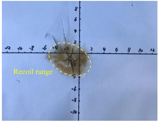 After the blasting of the test block, different-sized marks are generated on the whitepaper placed on the upper surface. The explosion of the explosive charge and the stemming material likely produces these marks. To some extent, these marks can reflect the extent of the blasting energy in propelling the stemming material upwards. Furthermore, they can serve as an indicator to evaluate the effectiveness of stemming (due to the fragility of the paper, when measuring the recoil area, only the yellow mark area is considered, while the torn areas are not included). As shown in Figure 4, we can easily measure the rebound range by referencing the scale on the whitepaper. Although this statistical method may be relatively crude, the discrepancies in rebound range resulting from different blasting schemes are evident. Hence, it indicates the degree of stemming material recoil.