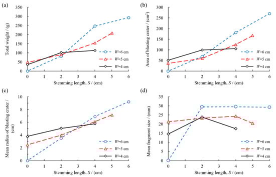 Based on Figure 5a–c, it can be observed that when the stemming material is clay and the burden W is 4, 5, and 6 cm, the total weight of fragments, the area, and the average radius of the blasting crater all increase with the increase of stemming length S.