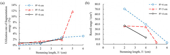 Figure 6. The variation of fragmentation energy consumption utilization rate and recoil area with stemming length. (a) Fragmentation energy consumption utilization rate; (b) recoil area.