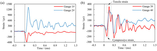 Figure 7. Taking the 1# to 4# strain waveforms with W = 6 cm and S = 2cm as an example to introduce typical dynamic strain signals. (a) 1#, 2# strain waveforms; (b) 3#, 4# strain waveforms.