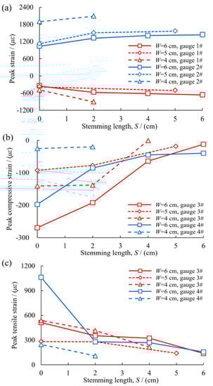 Figure 8. The variation of peak strains with stemming length; (a) The changes in the peak compressive strain of 1# strain gauge and the peak tensile strain of 2# strain gauge with stemming length; (b) The changes in the peak compressive strain of 3#, 4# strain gauge with stemming length; (c) The changes in the peak tensile strain of 3#, 4# strain gauge with stemming length.