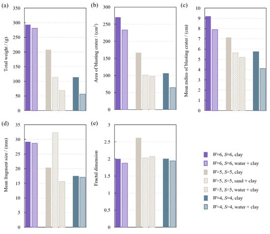 Figure 9. Comparison of the total weight of fragments, blasting crater area, crater mean radius, mean size of fragments, and fractal dimension of three stemming methods under different W. (a) Total weight of fragments; (b) blasting crater area; (c) crater mean radius; (d) mean size of fragments; (e) fractal dimension.