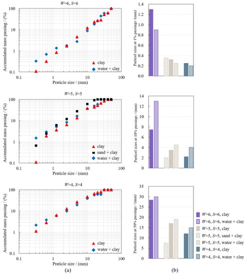 Figure 10. Fragments size distribution of different stemming materials tests; (a) accumulated mass passing vs. particle size; (b) particle sizes at 1%, 10%, and 50% mass passing percentages.