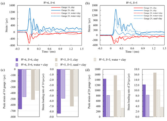 Firstly, the strain variations on the bottom surface of the test block (the surface where the blasting crater is formed) are analyzed. Figure 12a,b displays the strain waveforms measured with the burden (W) of 6 cm and 5 cm, respectively. It can be observed that the strain waveforms are similar to those obtained in Section 3.1.2, where strain gauge 1# shows a negative peak, and strain gauge 2# shows a positive peak, with the magnitude of the peak for gauge 2# being much larger than that of gauge 1#.