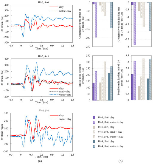 Specifically, when using sand + clay stemming, the peak compressive strain and the compressive strain loading rate are 201.7% and 79.1% higher, respectively, than those of clay stemming. The peak tensile strain and the tensile strain loading rate are 28.7% and 65.9% higher, respectively. When using water + clay stemming, the peak compressive strain and the compressive strain loading rate are 316.7~35412.2% and 187.0~8778.0% higher than those of clay stemming. The peak tensile strain and the tensile strain loading rate are 24.4~117.3% and 51.6~194.4% higher, respectively.
