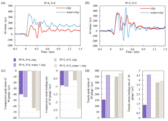 In the end, the gauge 4# strain variations on the top surface of the test block were analyzed. Figure 14a,b shows the strain waveforms measured under two W, which exhibit similar trends to those discussed in the previous sections. Peak compressive and tensile strains are recorded from the strain signals, and the compressive and tensile strain loading rates are calculated. The results are presented in Figure 14c,d. From the figures, it can be observed that when using clay stemming, both the peak compressive strain and the compressive strain loading rate, as well as the peak tensile strain and the tensile strain loading rate, are smaller than those of water stemming. Specifically, when using water + clay stemming, the peak compressive strain and the compressive strain loading rate are 6.0~11.7% and 6.7% to 301.4% higher, respectively, than those of clay stemming. The peak tensile strain and the tensile strain loading rate are 8.3~133.5% and 4.0~234.1% higher than those of clay stemming when using water + clay stemming.