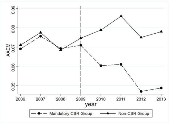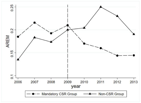 In Equations (1) and (2), i and t represent the company and year, respectively. The parameters α and γ correspond to individual and year-fixed effects, respectively. Treated is a binary variable, taking the value of 1 for companies obligated to publish CSR reports and 0 otherwise. Post is a time dummy variable, assigned the value of 1 for years following the implementation of the mandatory CSR information disclosure policy in 2009, and 0 otherwise []. And ε in all the above equations are random disturbance items. As for the dependent variables, this study focuses on the magnitude rather than the direction of earnings management, so our study uses the absolute value of earnings management as the dependent variable, with a larger absolute value indicating a higher degree of earnings management by the firm. Specifically, we adopted the absolute value of accrued earnings management (AAEM) and the absolute value of real earnings management (AREM) to measure the magnitude of earnings management by firms, building upon the frameworks established by Dechow et al. (1995) [] and Roychowdhury (2006) [], respectively. Accrued earnings management (AEM) is computed using the modified Jones model [], which incorporates three key indicators, i.e., abnormal operating cash flow, abnormal production costs, and abnormal discretionary expenses of a firm. AEM captures managerial behavior whereby accounting standards are utilized to mask the true economic condition of the company. On the other hand, real earnings management (REM) is calculated by the real earnings management model proposed by Roychowdhury (2006) [], who argues that firms can achieve real earnings manipulation by reducing the price of their products to increase the volume of their sales, reducing the cost of sales by producing excess products, and reducing the discretionary spending of the firm.