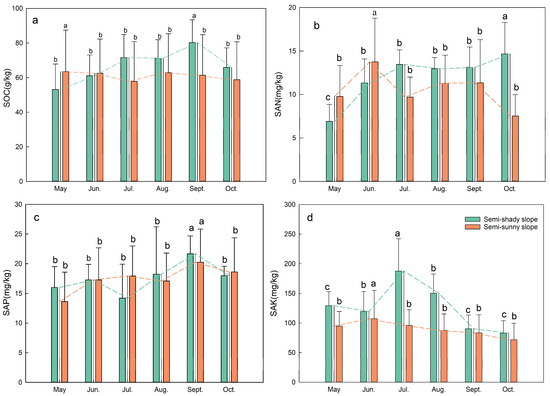 3.1. Temporal Variation in SOC and Soil Available Nutrients