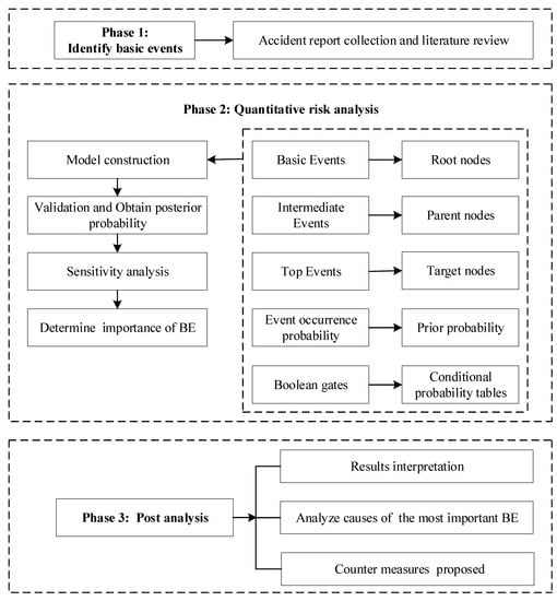 FTA, as a kind of static analysis instrument, is incapable of updating the status probability [], but a Bayesian Network (BN) is a factorization of a probability distribution along with a directed acyclic graph []. Unlike FTA, BN is created only using expert judgment, factor correlation, or a literature review and cannot determine how failures lead to unwanted events. Therefore, the integration of FTA and BN has become a potential solution for obtaining more accurate estimation of probabilities, and it is expected to minimize method-related constraints, a common problem in applying FTA alone. Several scholars have integrated the FTA into the BN when analyzing ship accidents. Ugurlu et al. (2022) [] mapped FTA into a BN and used a dynamic risk analysis methodology to analyze the risks of grounding accidents over 15 years, starting in 2005. Wang et al. (2021) [] used an FTA-BN algorithm to present a framework for identifying critical risk factors for ship fire accidents. Wu et al. (2021) [] created a data-driven BN model to analyze potential hazards for electric vehicle fire accidents, which took place in China from 2011 to 2018, and highlighted that charging electric cars transported aboard ships would increase the probability of car fire occurrence. Cenk et al. (2021) applied FTA and a Bayesian Network (BN) analysis to establish the risk level by defining the level of relationship among factors, and then evaluated its impact on grounding []. Since the occurrence of certain numbers of basic events under FTA may not always be observed or determined, expert judgment may help determine the probabilities of those basic events.