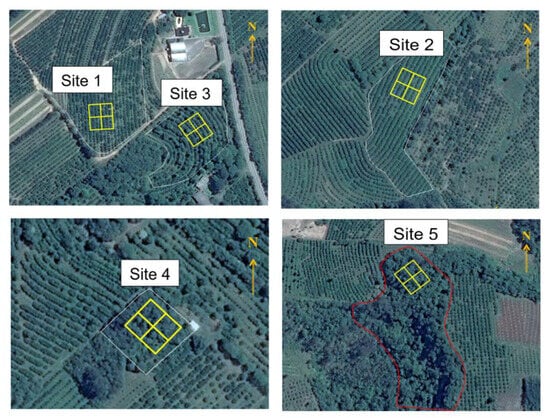 Location of the sampling grid in each plot (30 m × 34 m) marked in yellow, where white or red parts are limits of each site. Site 1: conventional citrus (Cc); site 2: organic citrus (Co); site 3: citrus agroforestry biodynamic (Cs); site 4: forest with 40 years of regeneration (F40); and site 5: forest with 200 years of regeneration (F200). Source: Google Earth (2014).